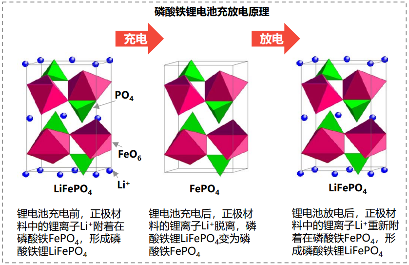 當(dāng)鋰電池放電時,Li+從負(fù)極材料中脫離,穿過電池隔膜和電解液后回到正極材料,F(xiàn)ePO4在Li+嵌入后變回LiFePO4 ,完成放電過程。